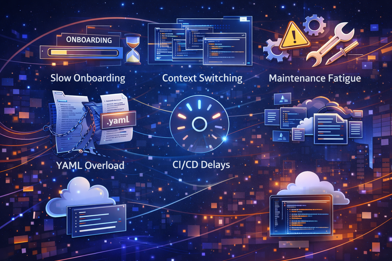 Slow onboarding, Context switching, YAML overload, CI/CD delays, Lack of visibility, Maintenance fatigue, Developer burnout